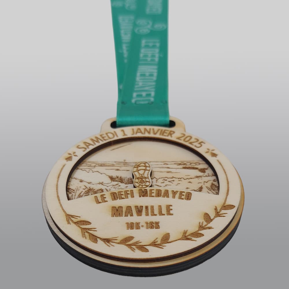 Organiser un trail nature est l’opportunité de faire partager son terrain d’entrainement à de nombreux passionnés course à pied, de nature et de paysages à couper le souffle comme il en existe tant en Bretagne. C’est aussi pour eux l’occasion de se retrouver entre amis. Rendez ce moment inoubliable en coucounant leur performance d’une médaille en bois. Pour de nombreux participants, cela sera même leur premier trophée, la récompense de tous leurs efforts. La médaille pour un trail nature sur les terres bretonnes (Finistère, Cote d’Armor, Morbihan, Ille et Vilaine) est personnalisable selon vos envies : forme, couleur du ruban, textes…et pour encore plus de personnalisation, n’hésitez pas à envoyer un message ou à prendre contact directement par téléphone. Dimensions :